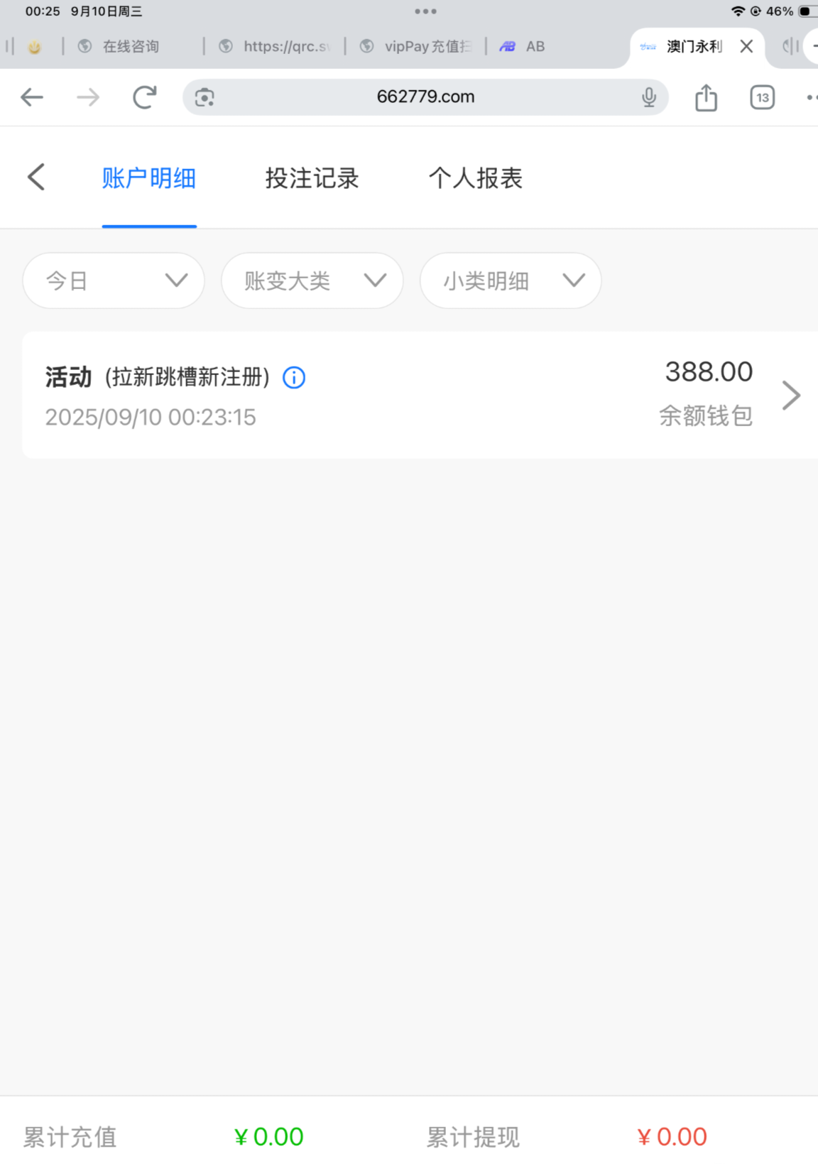 永利出了个新活动,跳槽彩金,需要近期10天内平台充值,达到就可以申请,最近有玩的老哥可以去,我申请到了388,但是打输了,